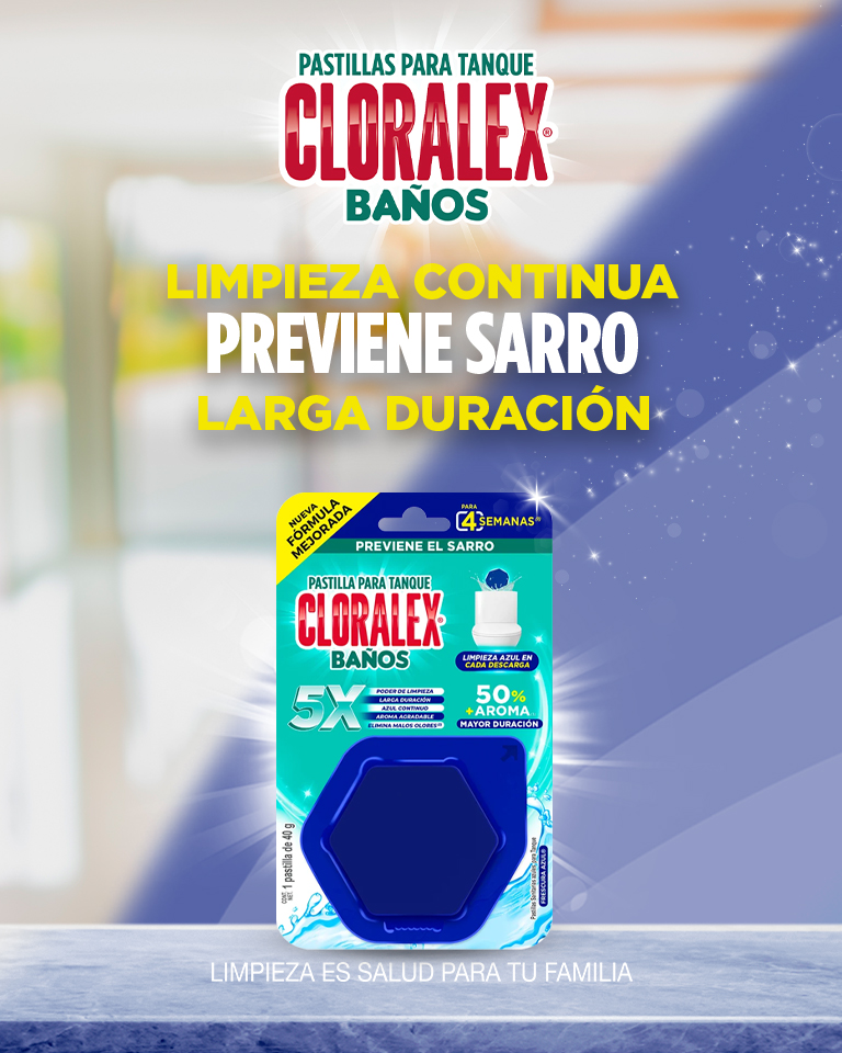 Mantén tu baño limpio por más tiempo con las pastillas azules de Cloralex® Baños. Su nueva fórmula mejorada 5X ofrece mayor poder de limpieza, larga duración y azul continuo.
